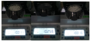 2. 將防風盤、支架、樣品盤一一裝好,接通電源,按下開機鍵,顯示屏進入開機界面,首先按去皮鍵減去樣品盤重量,后將100g砝碼放入托盤進行校準;