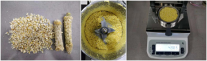 3. 將玉米一粒粒掰開,放入攪拌機中進行攪拌,充分攪拌成玉米面后,用實驗勺取365g玉米面均勻鋪在樣品盤上,設置好合適的溫度后蓋下上蓋,按下“START”鍵開始測試;蜂鳴兩聲后,儀器自動停機,測試結束,可在液晶顯示屏查看測試后玉米面的水含量為47.02%;