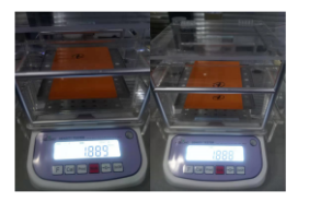 3. 將塑料板材(樣品1)放在架子上面顯示空氣中的重量138.80g,然后按mode鍵記錄下重量,再將塑料板材放入水中顯示水中重量65.47g,按下mode鍵記錄下重量。顯示密度值1.889g/cm3。