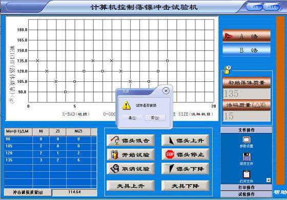 試驗開始時,首先選擇試驗方法,估計一個初始質量和Δm值,進行試驗,如果第一個試樣破損,用砝碼Δm減少落體質量;如果第一個試樣不破,須用砝碼Δm增加落體質量依此進行試驗??傊?,利用砝碼減少或增加落體質量,取決于前一個試樣是否破損。20個試樣試驗后,計算破損總數N,如果N等于10,試驗完成;如果N小于10,補充試樣后,繼續試驗直到N等于10;如果N大于10,補充試樣后,繼續試驗直到不破損的總數等于10為止,最后由系統自動計算沖擊結果。
