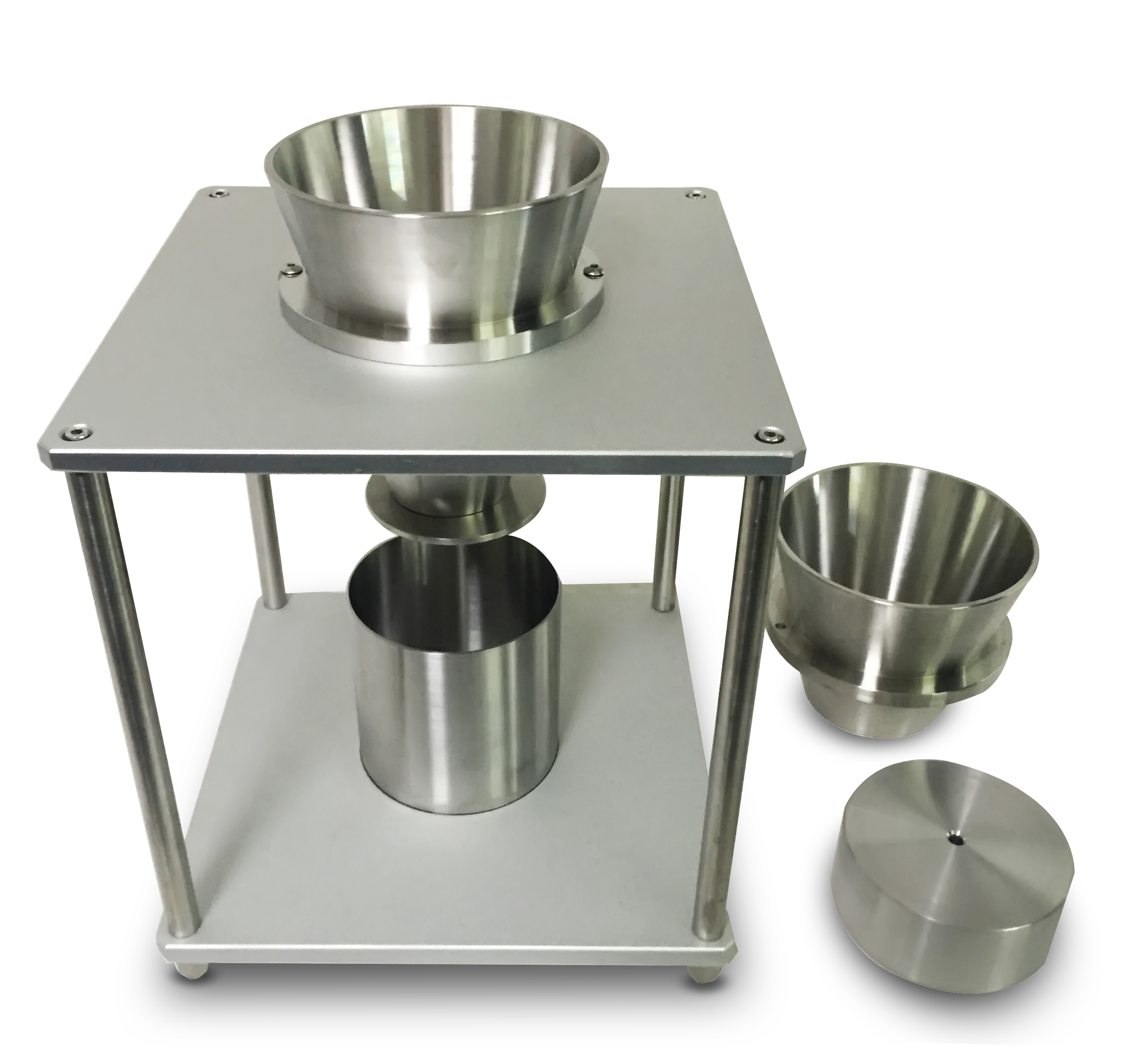 原理:在規(guī)定條件下,將試樣從一個(gè)具有規(guī)定形狀的漏斗中漏下,裝滿一個(gè)已知容積的受容器后,測定此粉體的質(zhì)量。