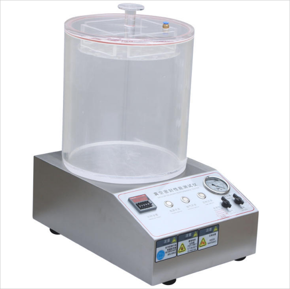 通過對真空室抽真空,使浸在水中的試樣產生內外壓差,觀測試樣內氣體外逸情況,以此判定試樣的密封性能;通過對真空室抽真空,使試樣產生內外壓差,觀測試樣膨脹及釋放真空后試樣形狀恢復情況,以此判定試樣的密封性能。